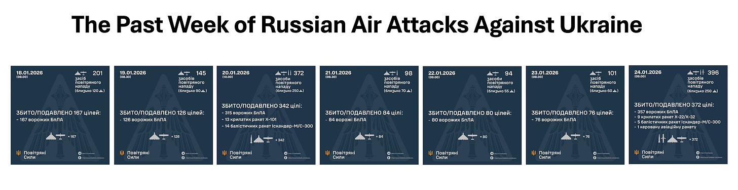 Russia’s Aerial Strike Campaign. Russia conducted large strikes again this week against multiple targets in Ukraine. Key targets were parts of the energy production and distribution network, although civilian targets were also struck. One of the largest strikes occurred on the evening before the latest round of peace talks. This strike, employing nearly 400 drones and missiles, resulted in power cuts to nearly 80% of Ukraine.