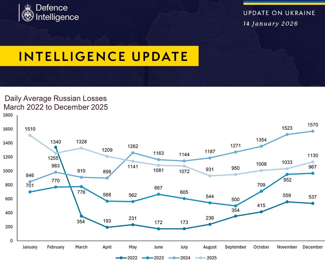 To provide context for these comments, cumulative Russian casualties in the war currently stand at around 1.1-1.2 million. The British Defence Intelligence regular update on this issue on 15 January 2026 published a figure of 1.213 million Russian casualties.