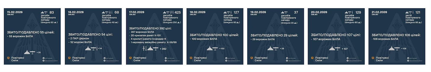 The Energy War Continues. Russia’s systematic campaign against Ukrainian energy infrastructure continued during the reporting period. Russia Matters reports that “every power plant in Ukraine has been damaged by Russian attacks, according to Volodymyr Zelenskyy’s February 2026 estimate.” At one point, approximately half of Kyiv’s 12,000 apartment buildings lost heating. The human toll continues to rise. On 12 February, an attack on Kramatorsk killed a mother and 11-year-old daughter and wounded 16 others.