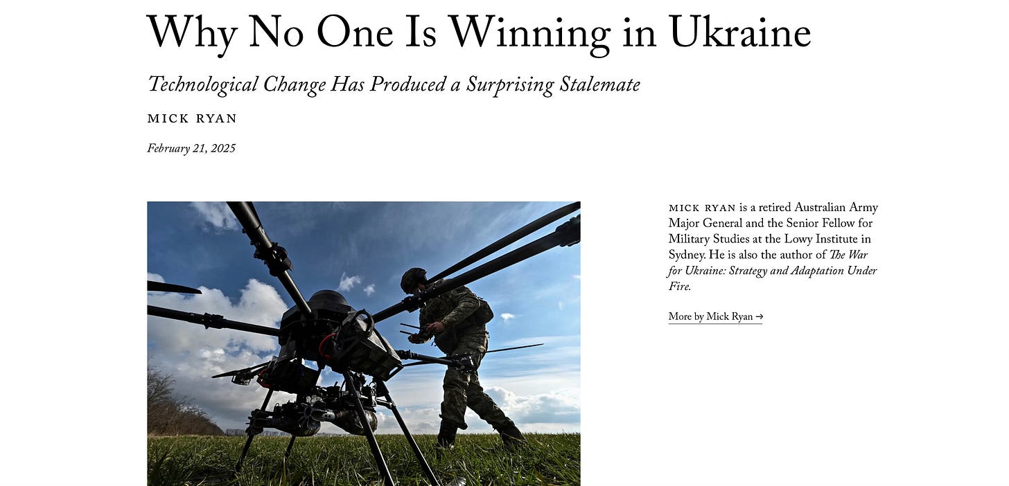 Some time ago, I pitched a story to Foreign Affairs about the changes in warfare we have witnessed over the three years since the Russian large-scale invasion of Ukraine. Too many assessments of the war pose arguments about changes in the character and nature of war through the lens of only studying this war. That is insufficient to truly understand the many currents that influence this war, and the direction of war in general. There are many aspects of this war that are not new: surprise, the need for good leadership, the importance of mass and industrial production among them. As someone who has studied war as a phenomenon for a long time, has participated in some wars and studied many others, I wanted to provide an assessment of how Ukraine is changing some elements of the character of war, and what it means for the rest of us. Enjoy.