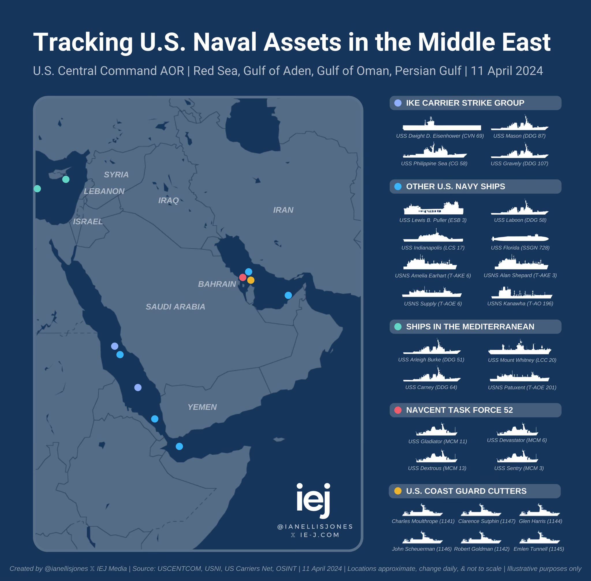 The U.S. has stated. before the attacks and since they began, that it will defend Israel, and has the military assets in the region to contribute to this mission. As the graphic from Ian Ellis Jones shows below, the U.S. has considerable ability to detect and intercept attacks on Israel.