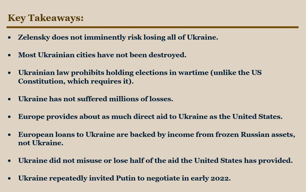 There have been so many accusations thrown at Ukraine and its president this week by the American president that the Institute for the Study of War published a detailed ‘fact checker’, which you can read at this link. It is a very good resource for those who might be tempted to believe any of the spurious and misleading statements that now appear to be spewing out of the White House on a regular basis. A summary of the White House ‘myths busted’ by ISW is shown in the image below.