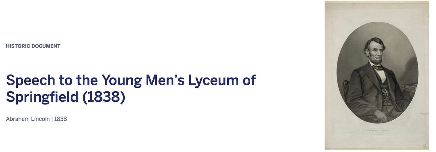 There is also an excellent report from Modern War Institute about the Battle of Kyiv, as well as an article that looks at grand bargains in history and what insights they might provide for the current negotiations over the war in Ukraine. Finally, I have included Lincoln’s Lyceum speech which seems quite appropriate for the times.