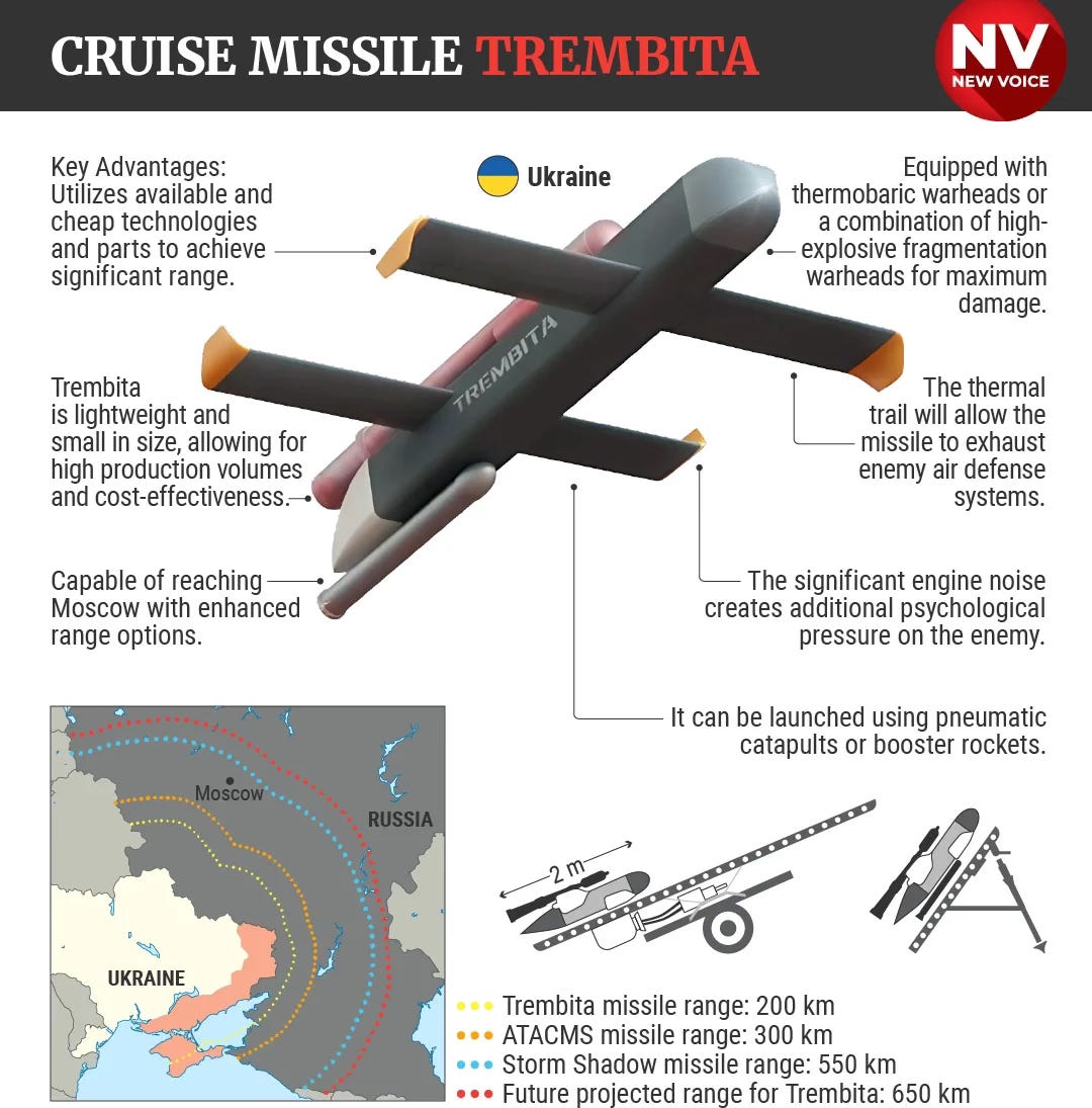 Ukraine this week unveiled another long range attack drone. Called the Trembita, it is designed as a medium range (about 400 kilometres) cruise missile with a smallish 20kg warhead. The real attraction of this missile is its cost - under $5000. This comes on the back of other Ukrainian revelations in the past month which include a massive underground drone manufacturing plant and tests of a new laser weapon called Trident designed to down drones and possibly other weapons.