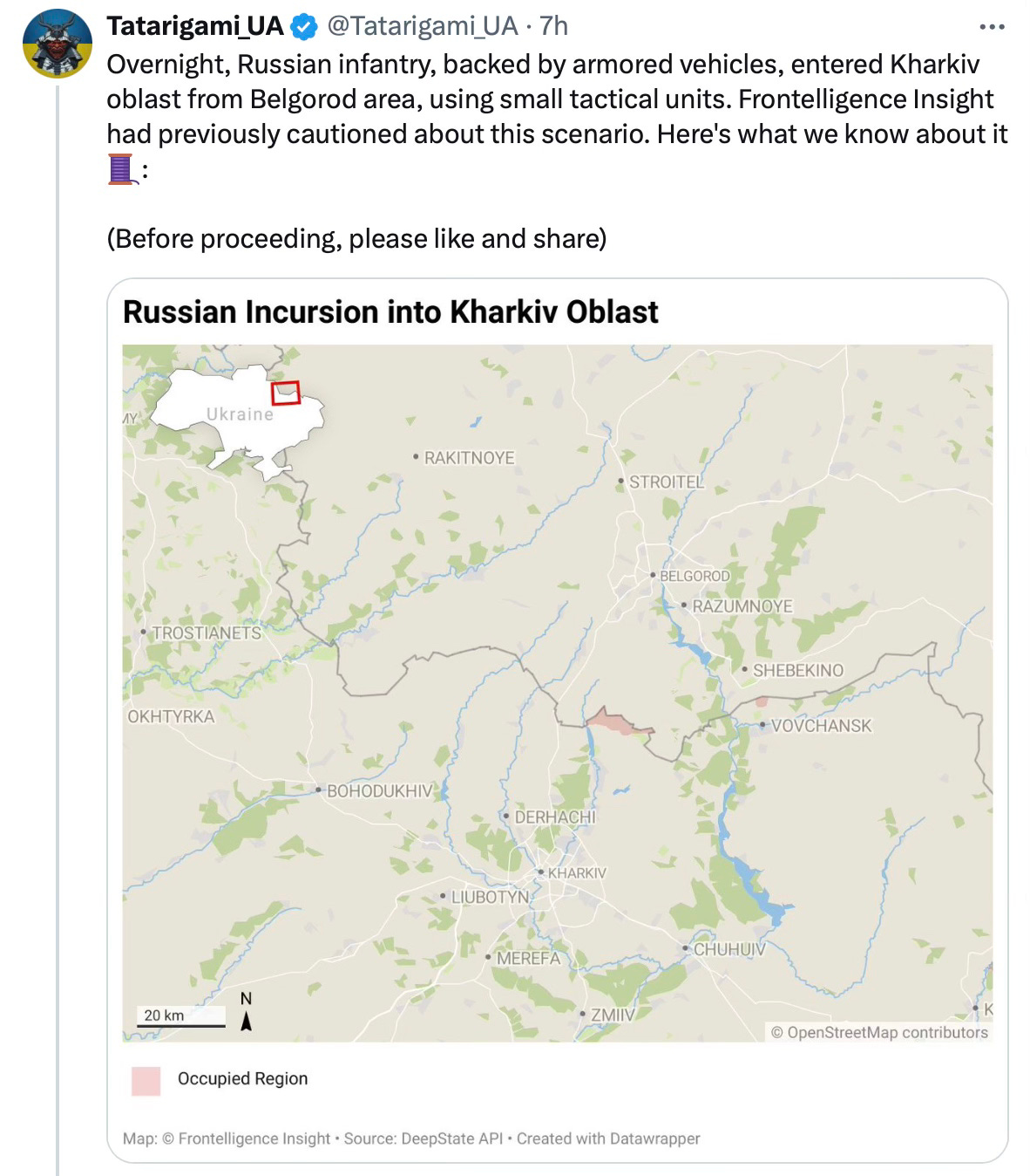 While the attacks at present appear to be small in scale, they have made a useful tactical penetration into Ukraine. It will force a shakeup in Ukrainian dispositions across the east of the country. And with at least two Corps available, this is an operation that the Russians can sustain for some time depending on their ultimate objectives. While capturing Kharkiv would require a much larger force and would need to be the Russian main effort to succeed, capturing additional Ukrainian territory might posture the Russians well for subsequent operations in Kharkiv.
