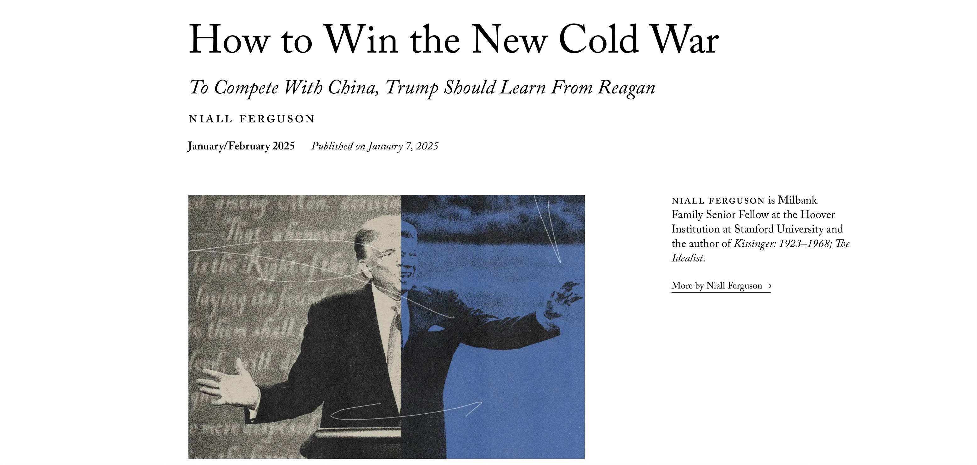 This article by Niall Ferguson published by Foreign Affairs during the week examines how the incoming Trump administration might be able to learn from the Reagan administration’s policies during the Cold War. He notes that “in 1980, many would have scoffed at any prediction that Reagan would end the Cold War—that he really would deliver peace through strength. Today, the argument that Trump might pull off a similar feat will strike many as absurd. But historical wisdom consists partly of remembering how unlikely epochal events seemed, even just a few years before they happened.” The full article is available at this link.