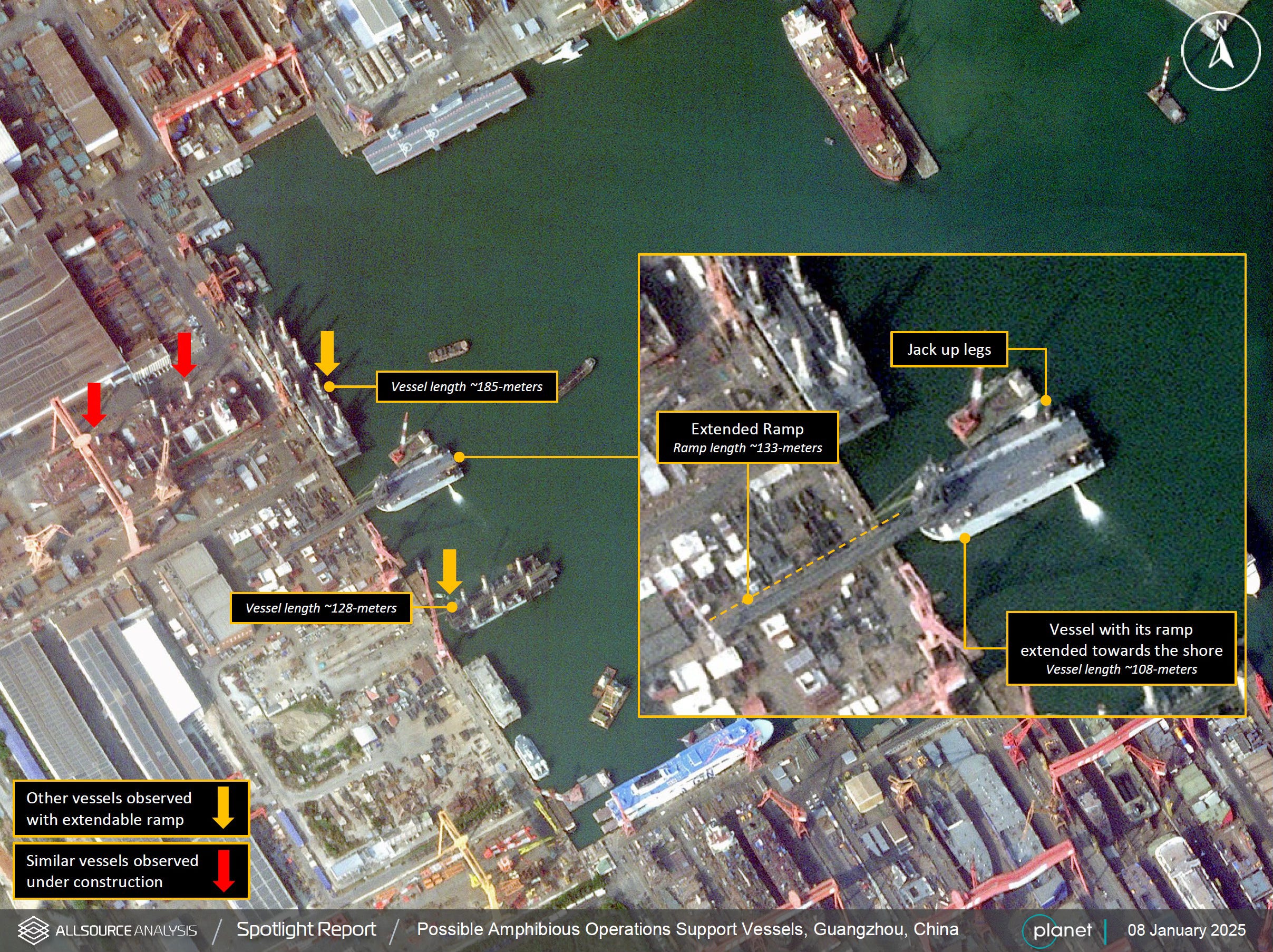 Late this week, it was revealted that China is constructing several large vessels which could act as transport vessels and floating piers capable of offloading large numbers of armoured vehicles as well as heavy logistic vehicles, across beaches in Taiwan that may not have previously been considered locations for Chinese amphibious assaults. In a post by AllSource Analysis on 11 January, at least two of these vessels were shown in a Chinese shipyard (image below).