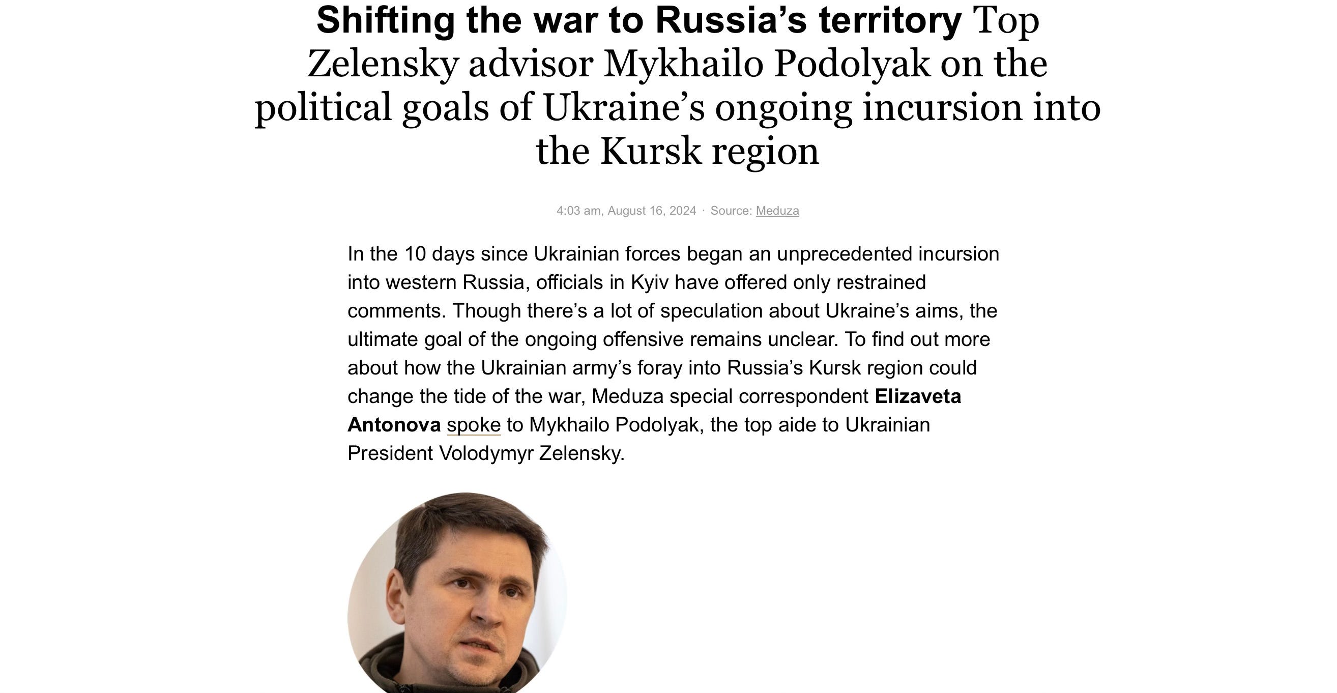 There has been a lot of speculation, including by me, about Ukraine’s strategic and political objectives of its current Kursk offensive. Clarity was added to this debate during the week by an interview given by Mykhailo Podolyak, a top aide to the Ukrainian President. He describes four key objectives of the ongoing Kursk offensive, one of which is the creation of a buffer zone. You can read the full interview here.
