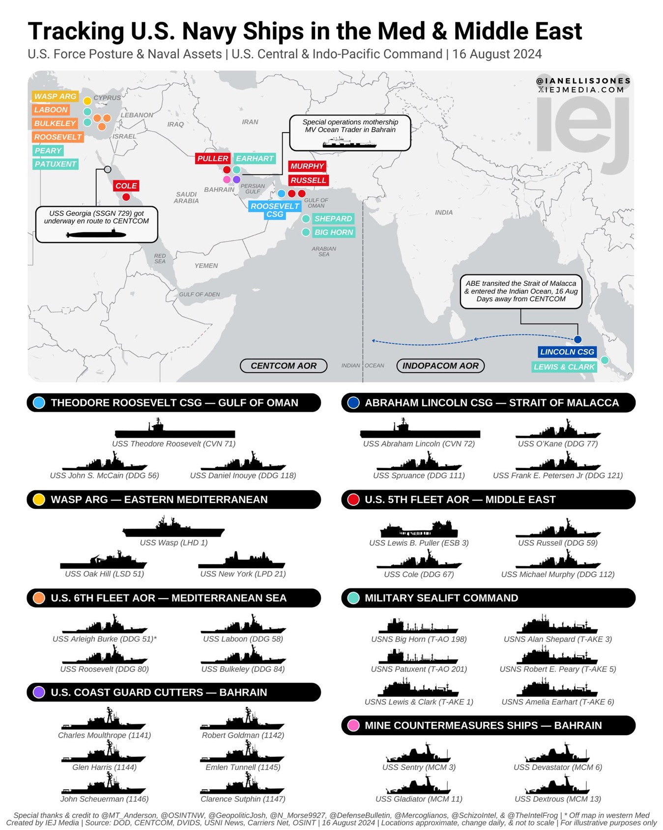 The U.S. has continued to deploy military forces to the region in the hope of deterring an Iranian attack on Israel. The current lay down of U.S. naval forces is described by Ian Ellis in his regular posts and in the infographic below.