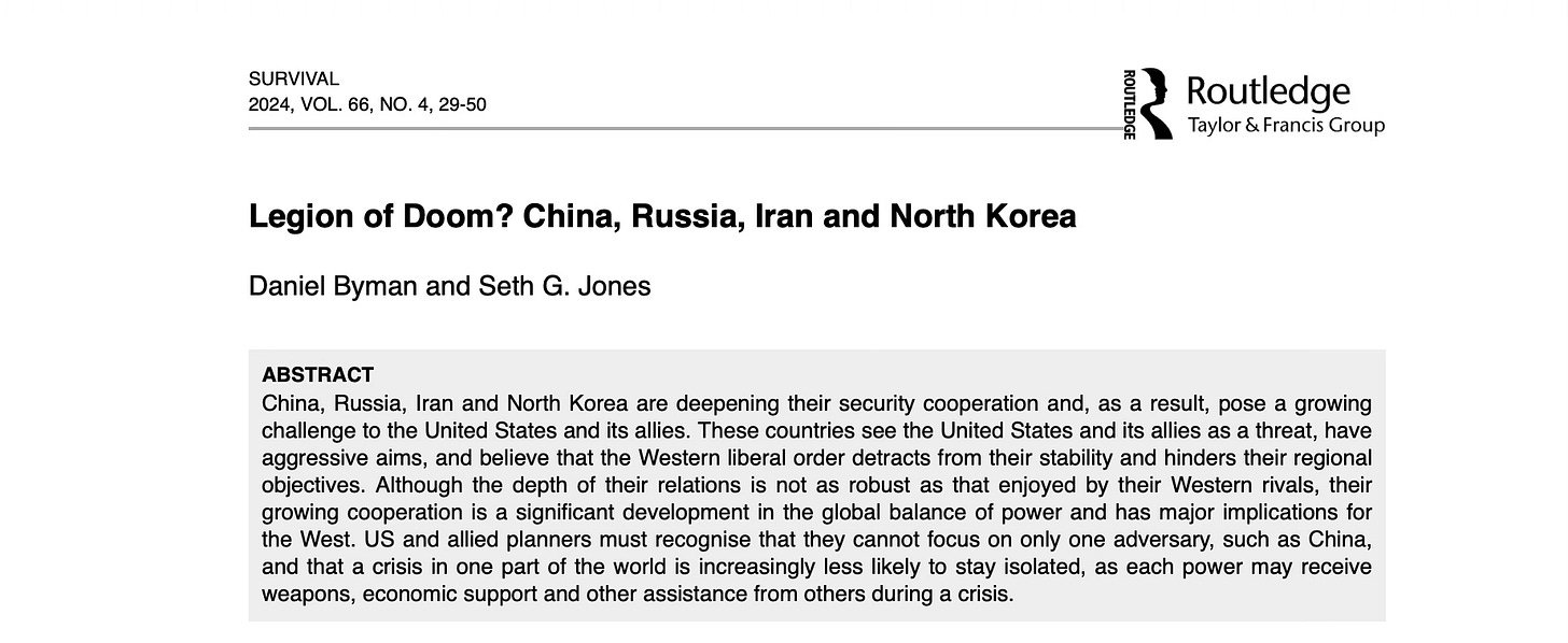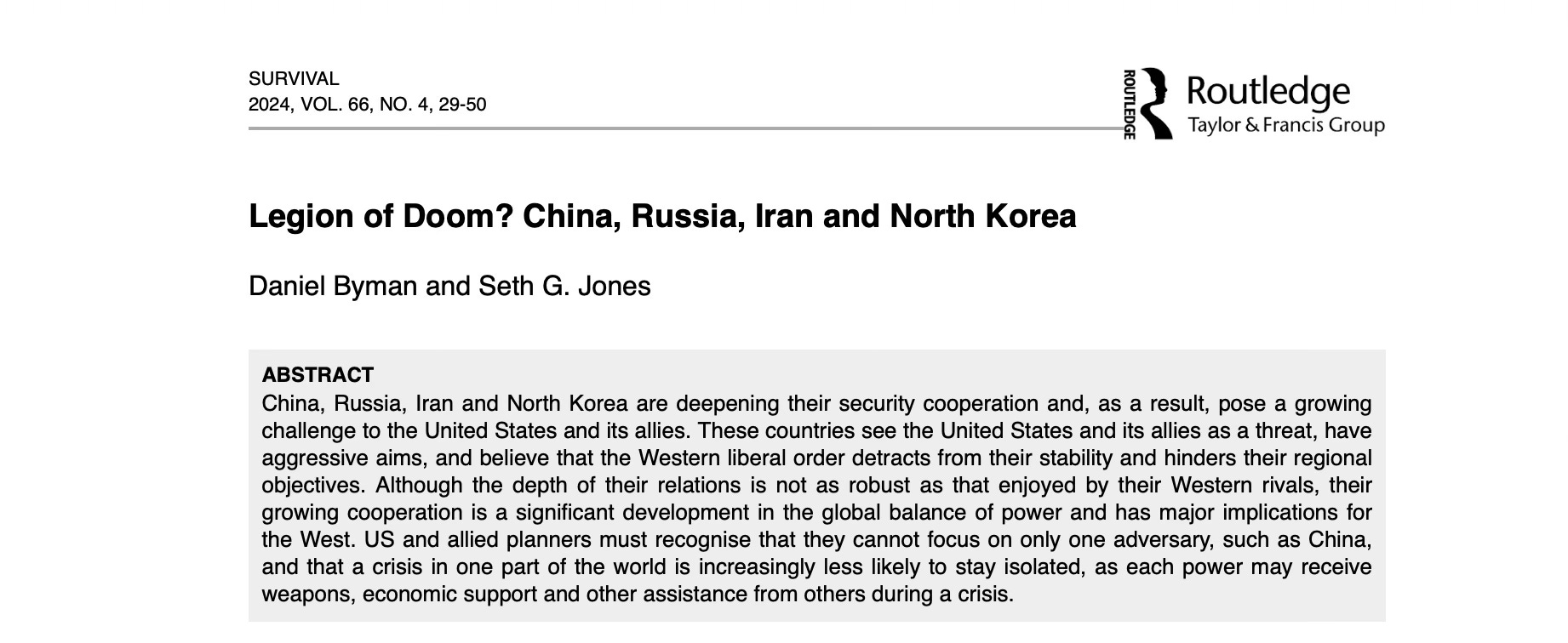 The latest edition of Survival has some very good articles. One of my favourites is this piece by Dan Byman and Seth Jones who explore the growing alignment of Iran, China, Russia and North Korea. The article notes that “although the depth of their relations is not as robust as that enjoyed by their Western rivals, their growing cooperation is a significant development in the global balance of power and has major implications for the West.” Unfortunately this is behind a paywall, but well worth reading if you have a subscription to Survival.