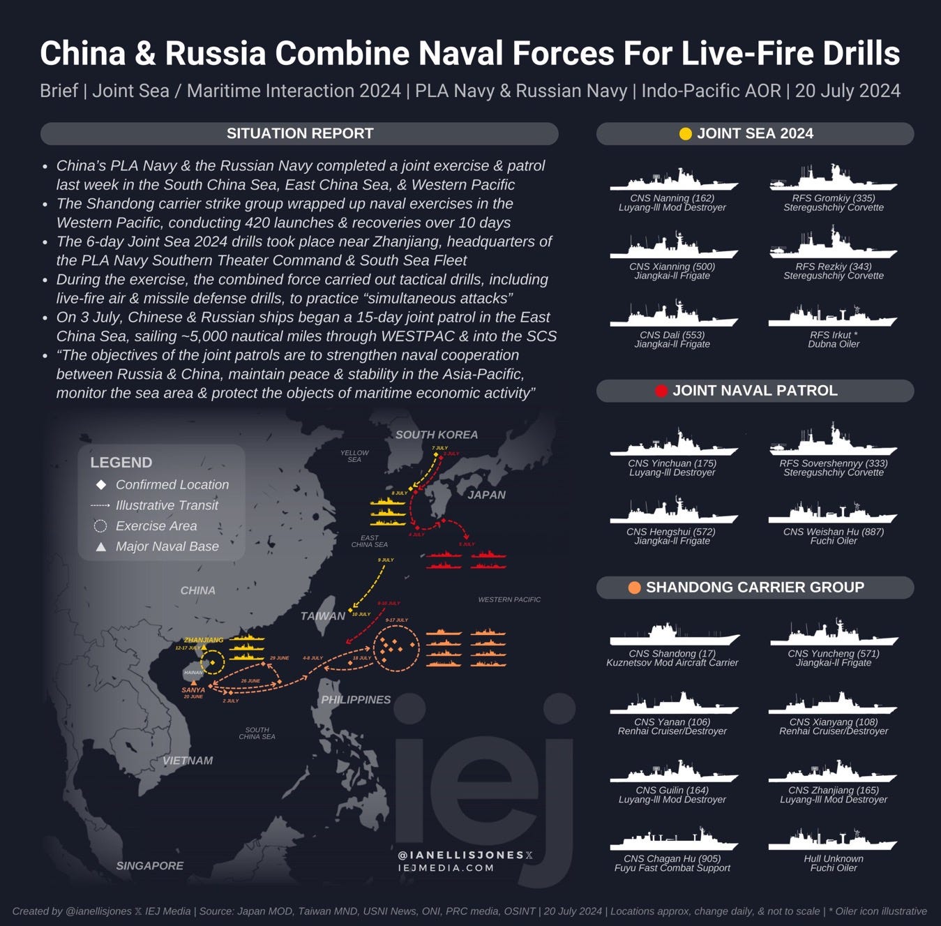 In the Pacific theatre, it has been a busy week for naval forces. China concluded its Shandong Carrier Battle Group deployment to the east of Taiwan and then Russia and China conducted joint maritime drills in the South China Sea, as well in areas to the east and north of Taiwan. Ian Ellis Jones has covered these exercises and I recommend following him on Twitter / X for updates. His graphic about this China-Russia collaboration is below.