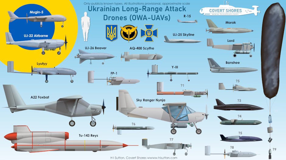For a full wrap up on Ukraine’s indigenous strike systems, I recommend following H.I. Sutton and his Covert Shores site. One of the excellent images from the site, showing Ukraine’s drone fleet, is below. These are regularly updated when new drones are detected or announced.