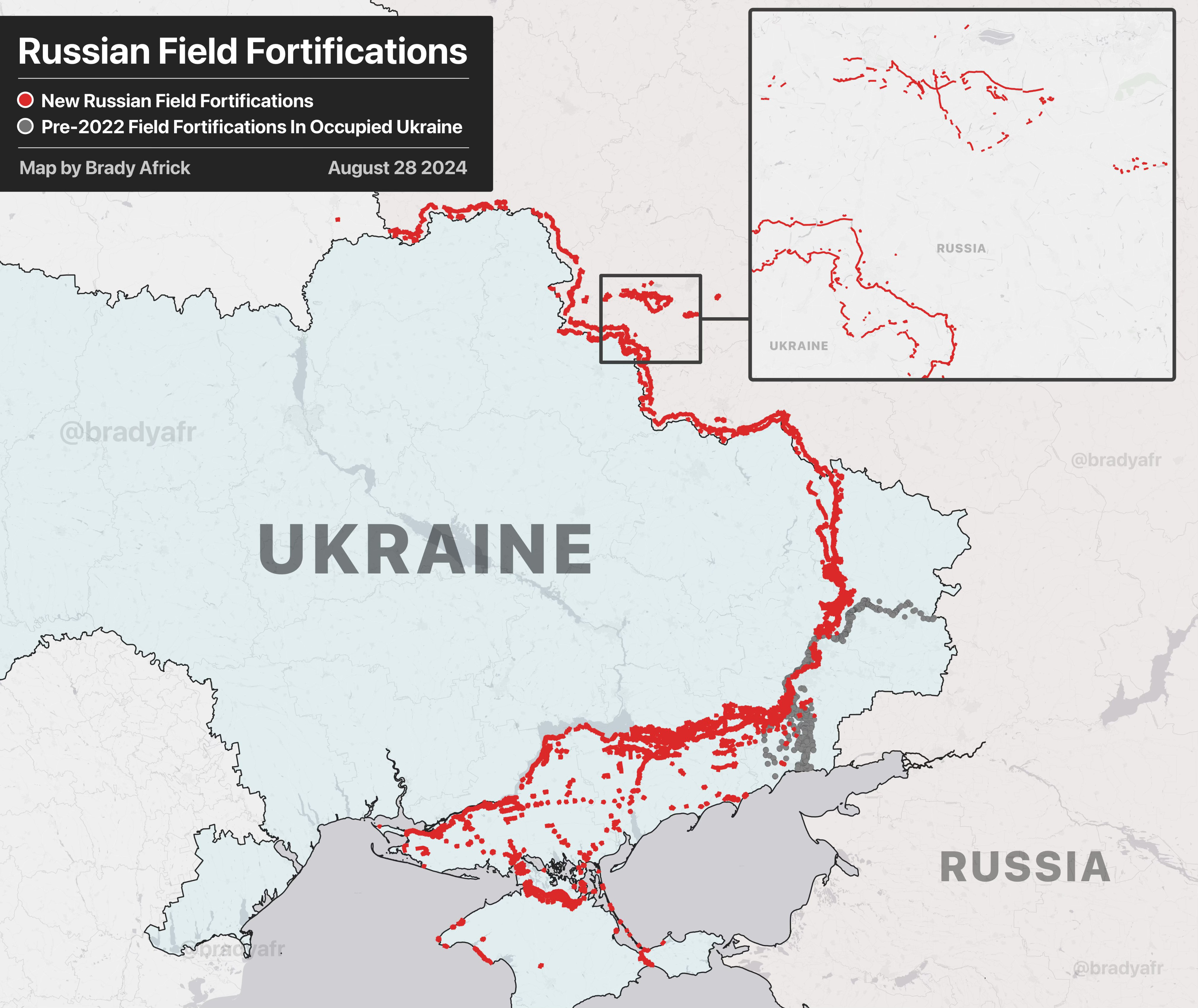 Also in Russia, the Russian military has been frantically expanding and improving its defensive works as a hedge against further Ukrainian advances in Russia. At least according to doctrine, defensive zones are sited to leverage existing natural features and also along anticipated future axes of advance by an enemy force to achieve ‘turn, disrupt, block or fix’ them. This is may be how the Russians are thinking, but in war, you can never be sure! Anyway, check out Brady Africk’s updated geospatial products that examines and charts Russian developments in their Kursk defensive works.