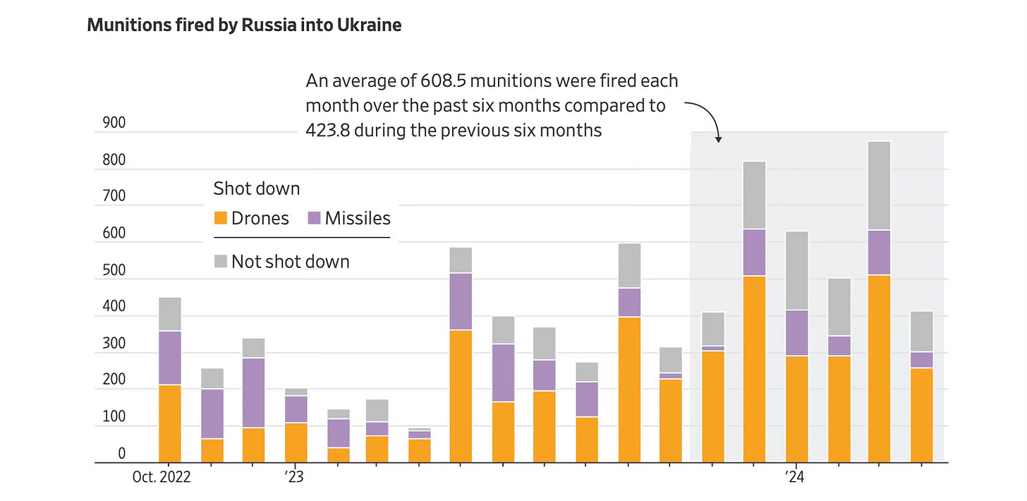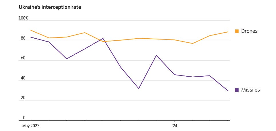 A couple of factors are driving this. First, the Russians have learned and adapted their tactics for aerial attack over the course of the war. There have been several evolutions in their approach including the large-scale adoption of Shahed drones, and a changing mix of drones and missiles, more complicated attack route planning, and increasing use of harder-to-hit ballistic missiles, which I described in an article about strike operations in the wake of my most recent visit to Ukraine.