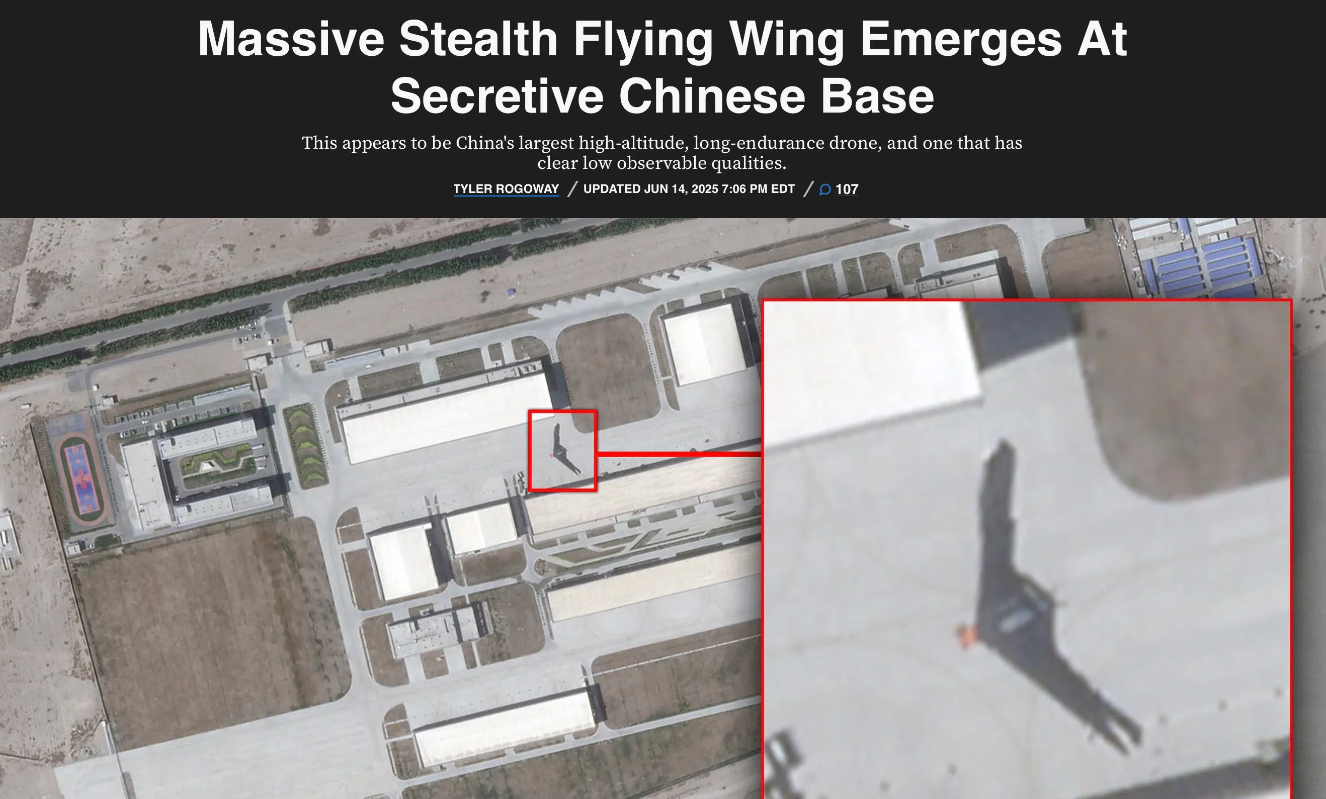 This week, images emerged of a large, stealthy flying wing aircraft at a Chinese base in Xinjiang province. The story from The War Zone notes that “the newly emerged aircraft itself appears impressive. It is a large flying wing that has a span of roughly 52 meters, or about 170 feet. The B-2 Spirit is 172 feet wide, for comparison, and the B-21 is a bit smaller. The best explanation is that this is a very large, high-altitude, long-endurance (HALE) stealthy drone.” You can read more at this link.