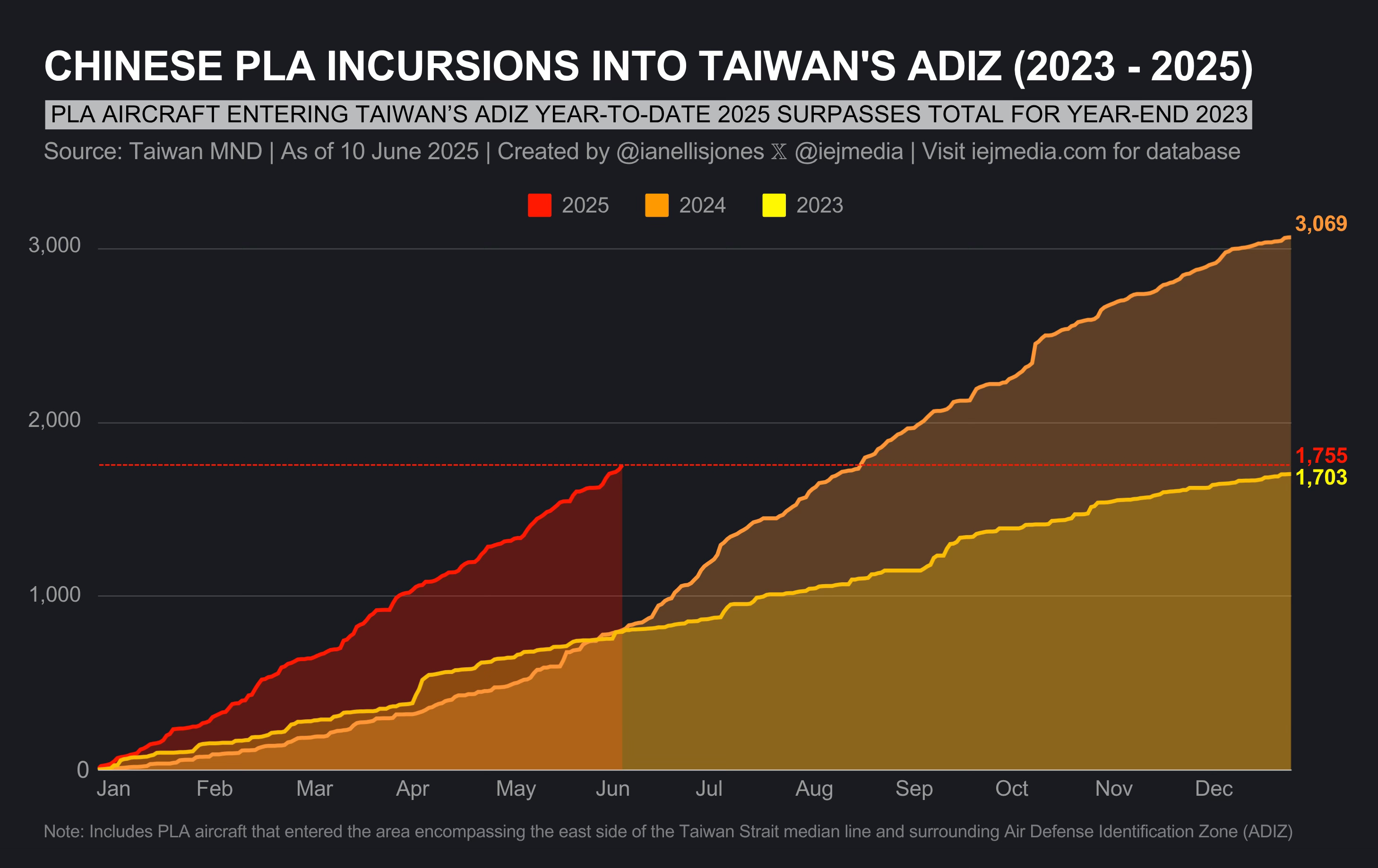 Chinese Incursions into Taiwan’s ADIZ. This week, Ian Ellis Jones released an updated graph on Chinese incursions into the Taiwanese ADIZ this year. China has sent 1,755 PLA aircraft into Taiwan’s ADIZ or across the median line so far in 2025. This is an increase of 118% over 2024. The 2025 total so far is more than the the total recorded for all of 2023 (1,703).