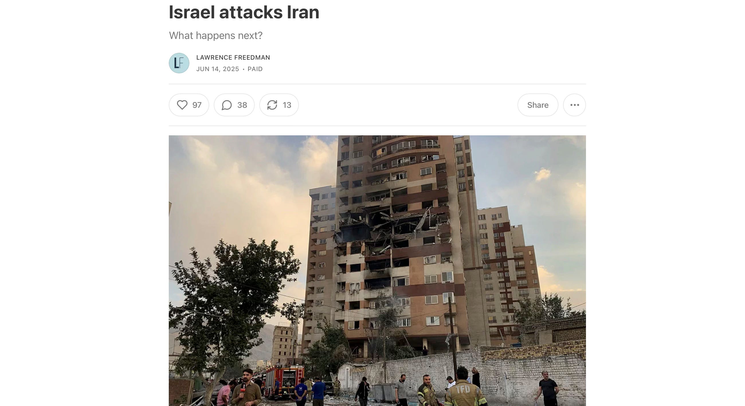 My regular update on global conflict. This week, Israel's expanding campaign against Iran, updates from Ukraine and the Pacific theatres as well as my weekly top 5 recommended reads.