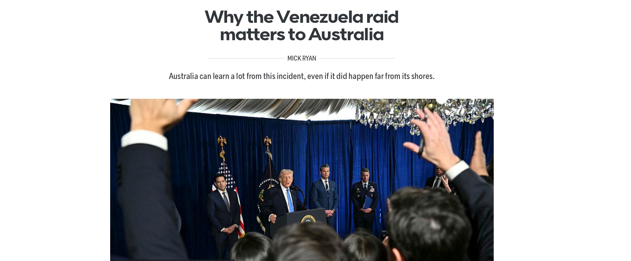 Just because we live at the bottom of the world, and many of our politicians are relatively complacent about national security (and who still refuse to spend more than just over 2% of GDP on defence), that does not mean the Venezuela raid has no lessons for us. It does. Therefore, below I have posted my article from the Lowy Interpreter on this topic, which was published just a short time ago.