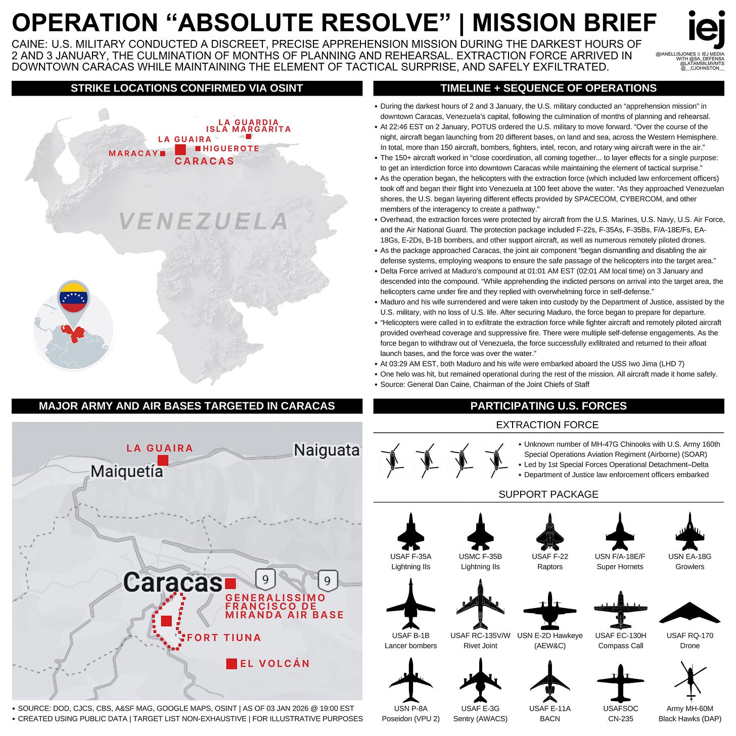 The raid appears to have gone, from an American perspective, relatively to plan. No U.S. service personnel were killed but there were some who received minor wounds. Reports from Venezuela indicate around 40 people on the ground there may have been killed, but we should wait for official confirmation of that. The chart below is a representation of the the conduct of Operation Absolute Resolve and the military assets employed in its execution.