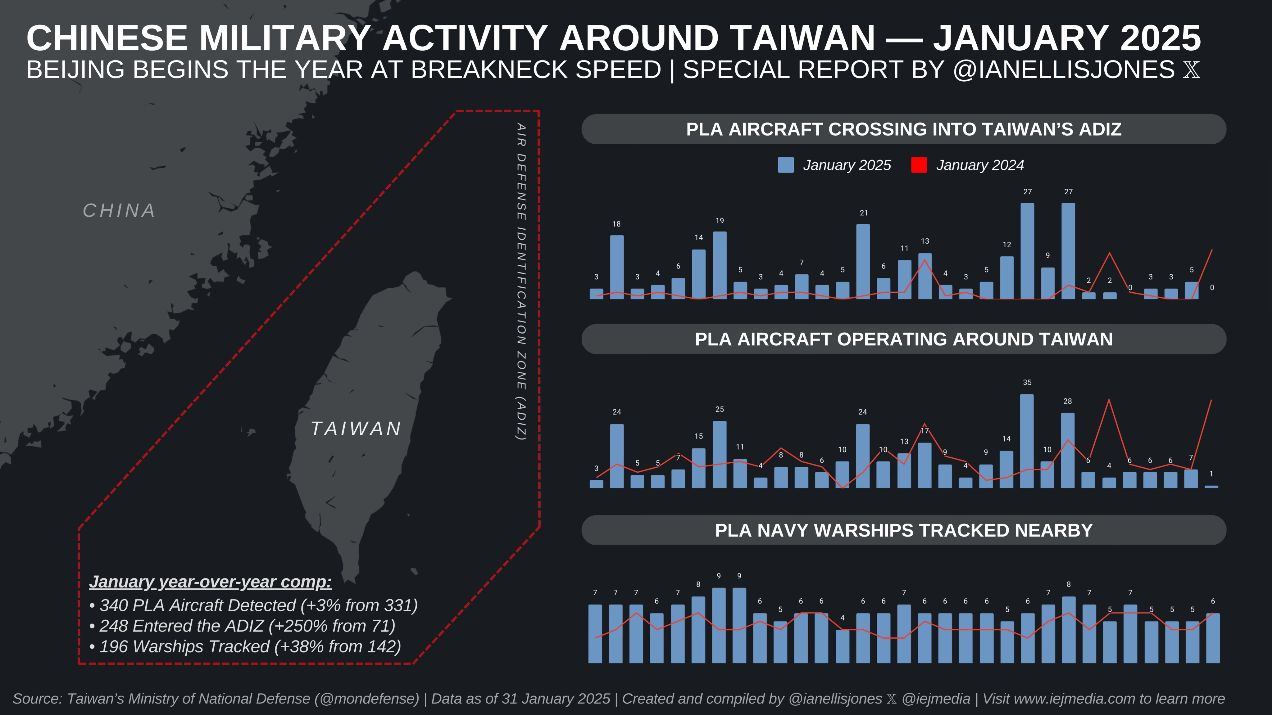These theatre commands, particularly the Eastern Theatre Command responsible for Taiwan, hold regular and increasingly larger and more sophistocated exercises. In the past couple of years these have expanded in scope (such as Joint Swords A and B last year) and have increasingly been conducted at little or no notice.